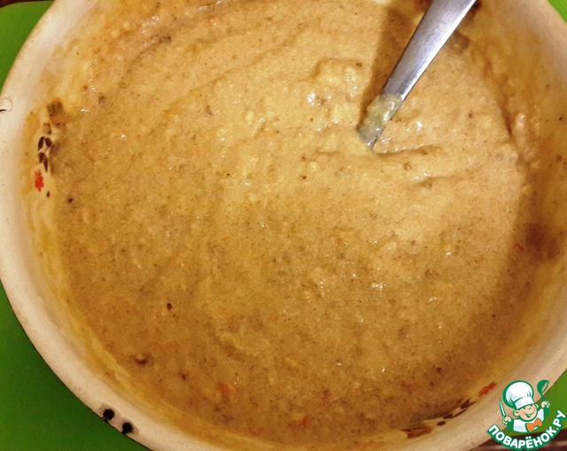 К орехово-мандаринной смеси добавляем муку, соду (в уксусе не гасите!) и хорошенько перемешиваем. далее добавляем яичную смесь и снова перемешиваем ложкой.