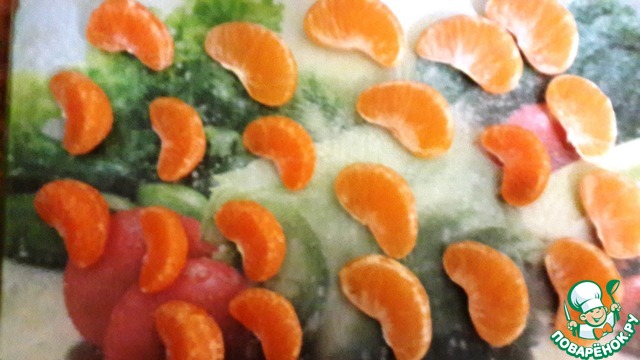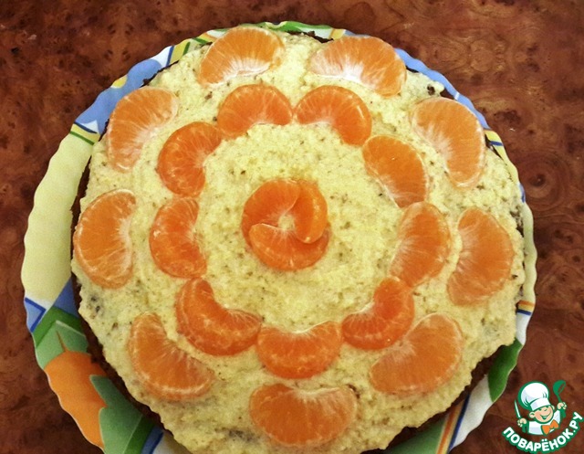 После того как основа нашего тортика остыла, разрезаем его так, чтобы получилась два коржа (если он по прежнему теплый, то даем еще постоять). смазываем первый корж на срезе нашим кремом и накрываем его вторым коржом (так, чтобы оба среза были в креме). смазываем верхушку кремом. украшаем с верху мандаринками. убираем в холодильник (минимум) на ночь. разрезаем на порционные куски, и можно кушать :)