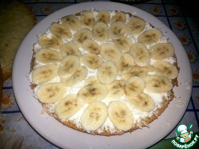 Нижний корж пропитываем сиропом, промазываем кремом и выкладываем банан, нарезанный тонкими ломтиками, слегка как бы вдавливаем его в крем.