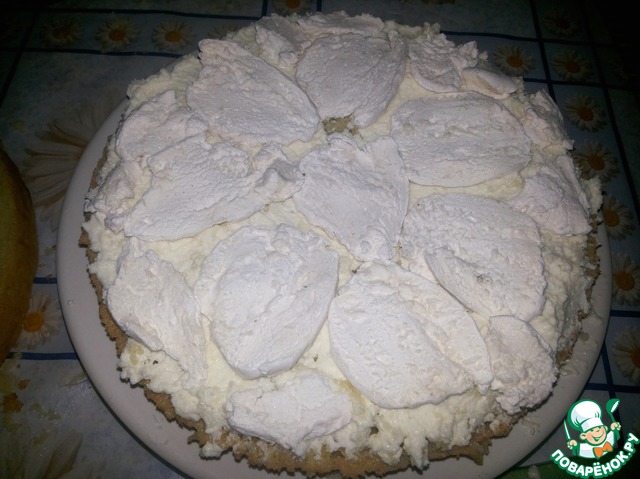 Следующий корж также пропитываем, смазываем кремом и выкладываем тонкие ломтики зефира.