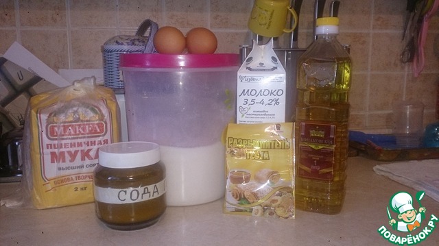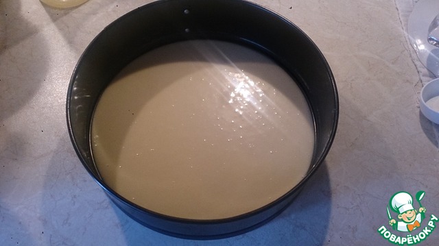 Наливаем в тесто стакан кипятка и взбиваем для равномерности. Выливаем часть теста в форму (смотря сколько хотим сделать коржей - у меня три). Ставим в нагретую до 180 градусов духовку на 25-30 минут. Готовность проверяем зубочисткой.