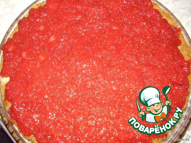 корж переложите на блюдо и сверху разложите уже густую начинку, разровняйте