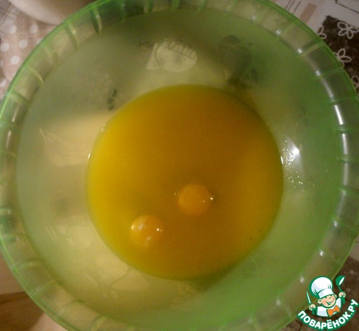 Для этого растопим масло. Добавим в него яйца, соль и соду.