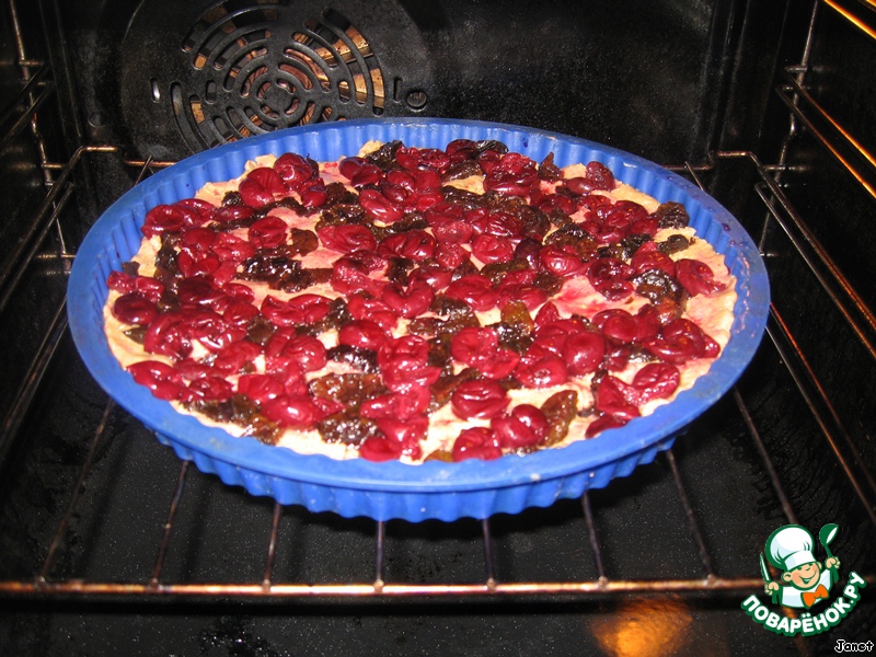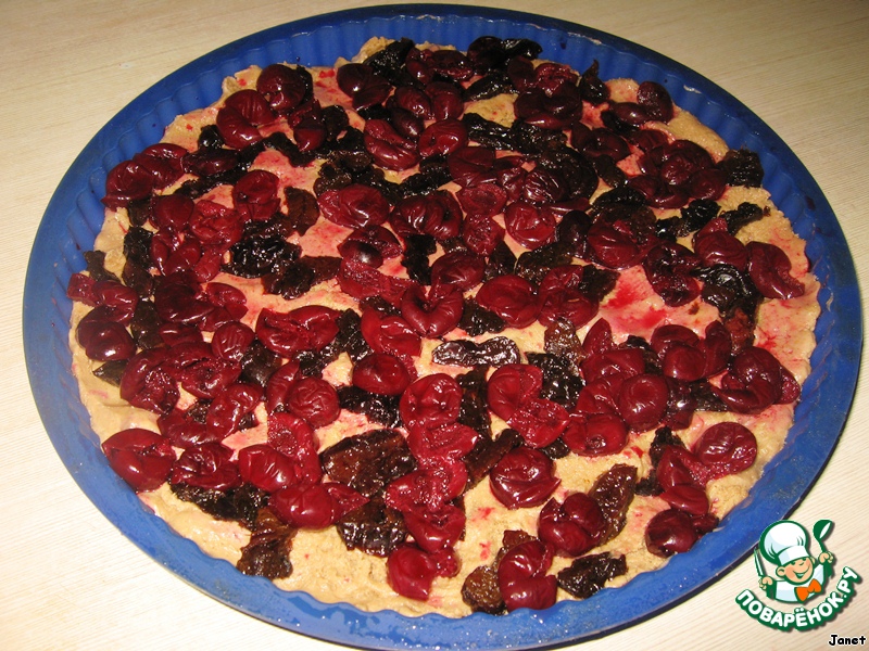 На тесто выложить вишню и чернослив, слегка утопить их в тесто руками.