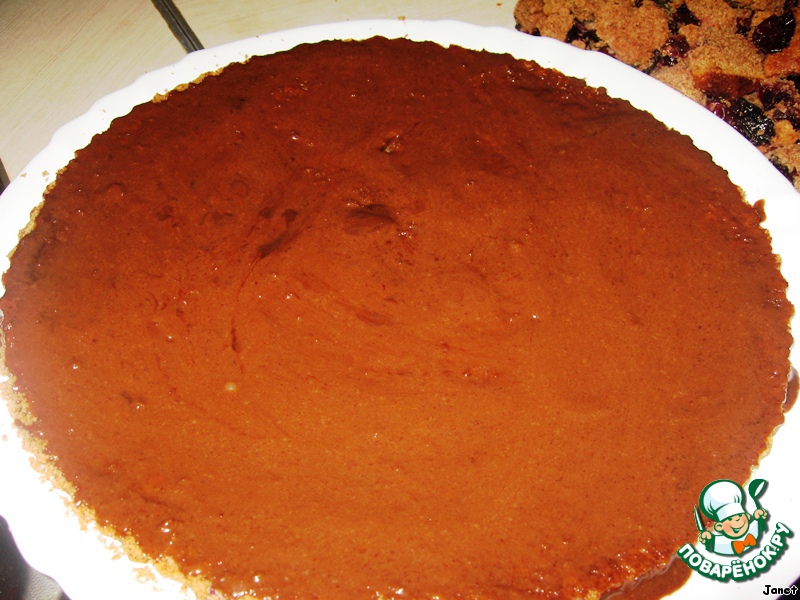 Нижний корж положить на блюдо и залить шоколадным кремом