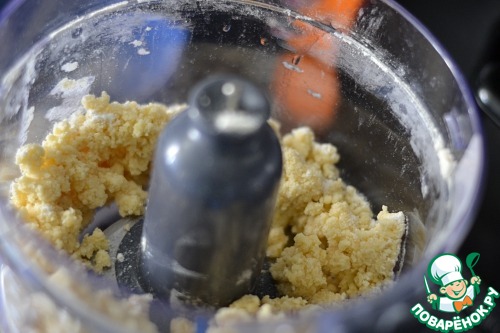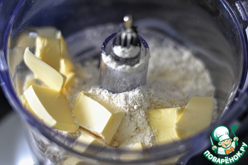 Готовим тесто: в комбайн поместить муку, сахар (50 г), молотый миндаль (15 г), щепотку соли. Нарезать кубиками холодное масло.