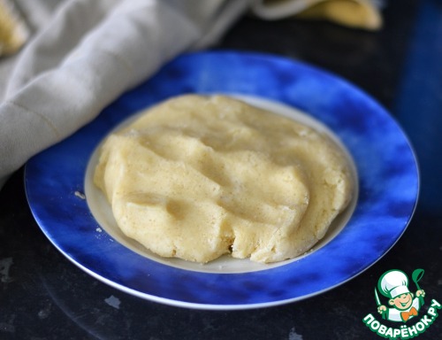 Превратить в однородную крошку. Влить 2 ст. л. холодной воды и перемешать до однородного теста, которое легко можно превратить в ком.