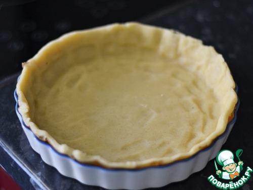 Подготовить форму для выпечки диаметром около 18-20 см. Перенести на нее бумагу с тестом. Подрезать лишнее тесто. Поместить снова в холодильник, пока готовим начинку.