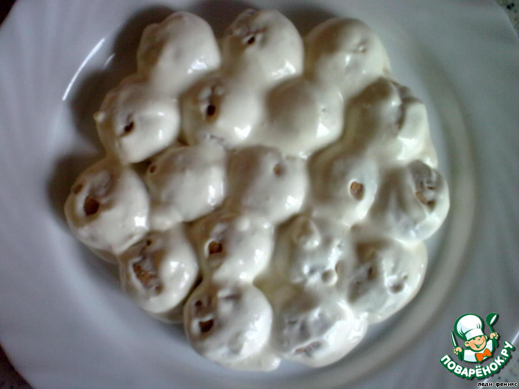 Шарики окунать в крем и выкладывать на блюдо слоями. Формуем тортик.