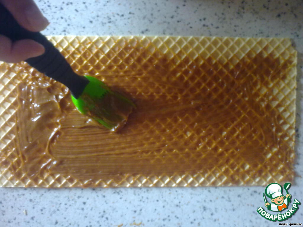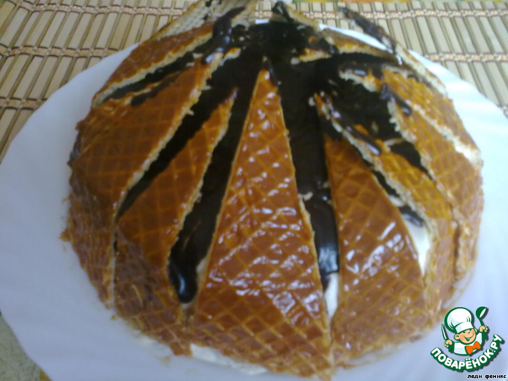 Потом вафельки размокают от сгущенки и закрываем ими торт, обливаем остатками глазури.