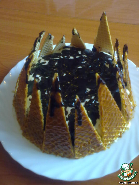 Торт облить шоколадной глазурью. И вокруг поставить вафельки.