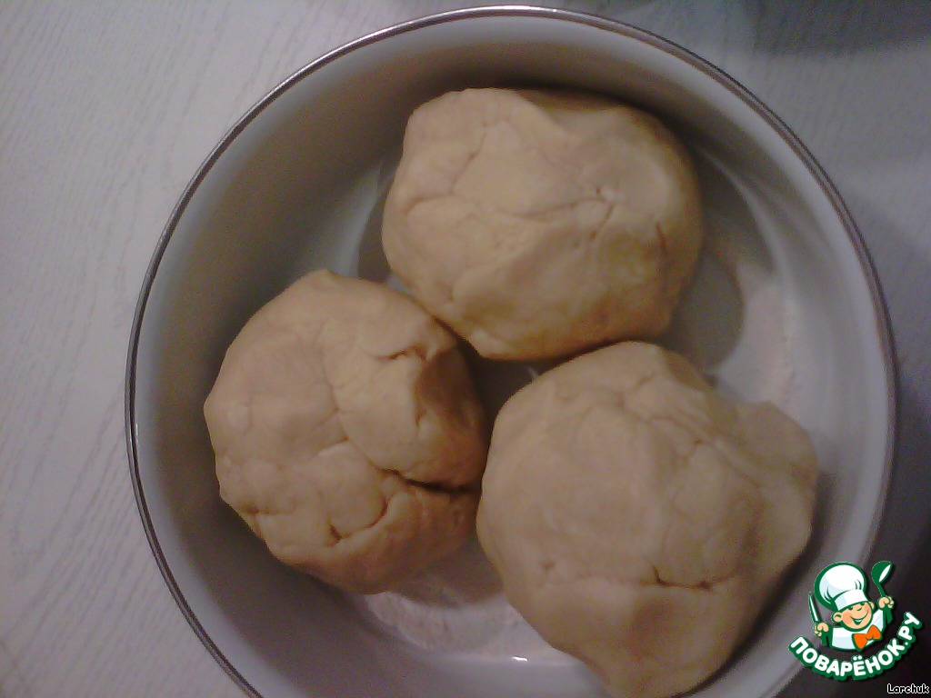 Для теста размягченный или растопленный маргарин размешиваем с мукой в крошку, добавляем желтки, ванилин, соль, гашеную соду. Если надо, добавляем муку, чтобы тесто не липло к рукам. Делим на 3 части и отправляем в холодильник минимум на 3 часа. У меня тесто ждет в холодильнике и ночь, и сутки и только становится лучше.
