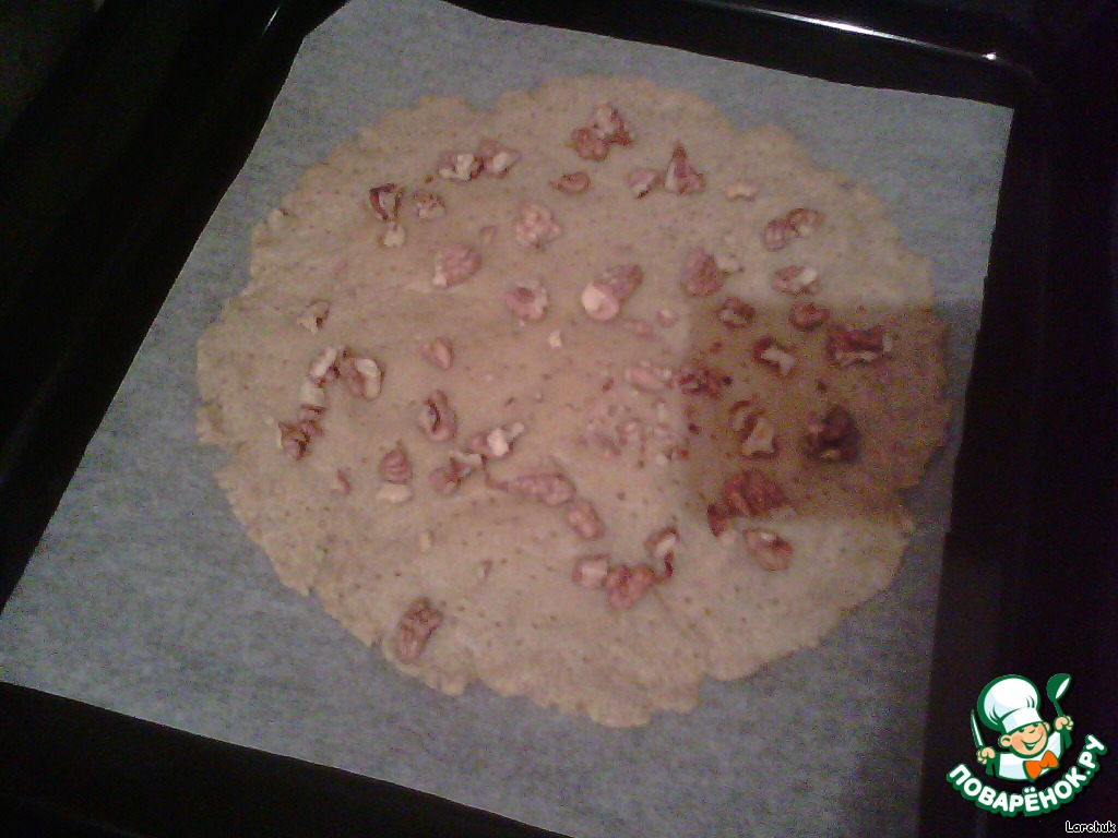 За 20 минут до начала приготовления коржей достаем тесто из холодильника. Готовим бумагу для выпечки, разминаем на противнях 3 коржа, накалываем вилкой и посыпаем их орехами. Количество орехов рецептом строго не лимитируется, пишу то количество, которое использую сама. Орехами торт точно не испортишь. Отправляем на 5-10 минут в духовку, разогретую до 220 градусов.