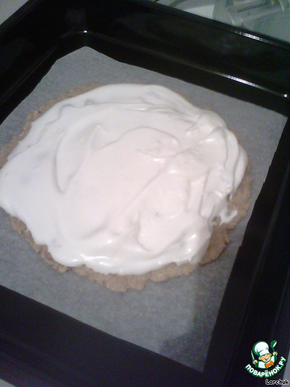 Пока коржи подпекаются, взбиваем белки с сахаром, солью и ванилином. Коржи достаем, покрываем белками и печем при 150 градусах, пока безе не зарумянится.