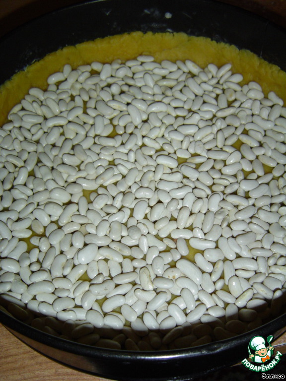 Тесто накрываем пищевой бумагой и сверху насыпаем сухую фасоль или горох; отправляем в духовку, разогретую до 180*С на 15 минут, а затем убираем бумагу с фасолью.
