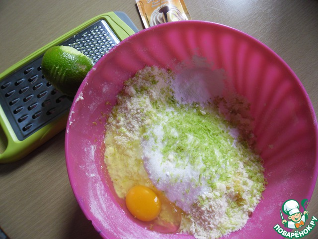 Добавить яйцо, цедру одного лимона, сахар и разрыхлитель теста.