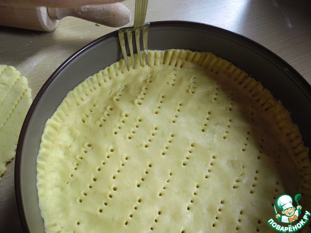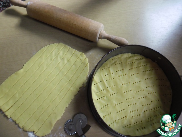 Большую часть выкладываем на дно формы (форму нужно взять разъемную или с низкими бортами), разравниваем пальчиками по всей поверхности дна формы и накалываем вилочкой. Меньшую часть раскатываем скалкой и разрезаем на полоски.