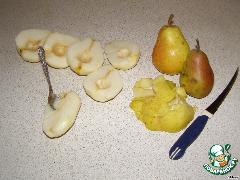 4 груши очистить, разрезать пополам, вынуть семенные капсулы.