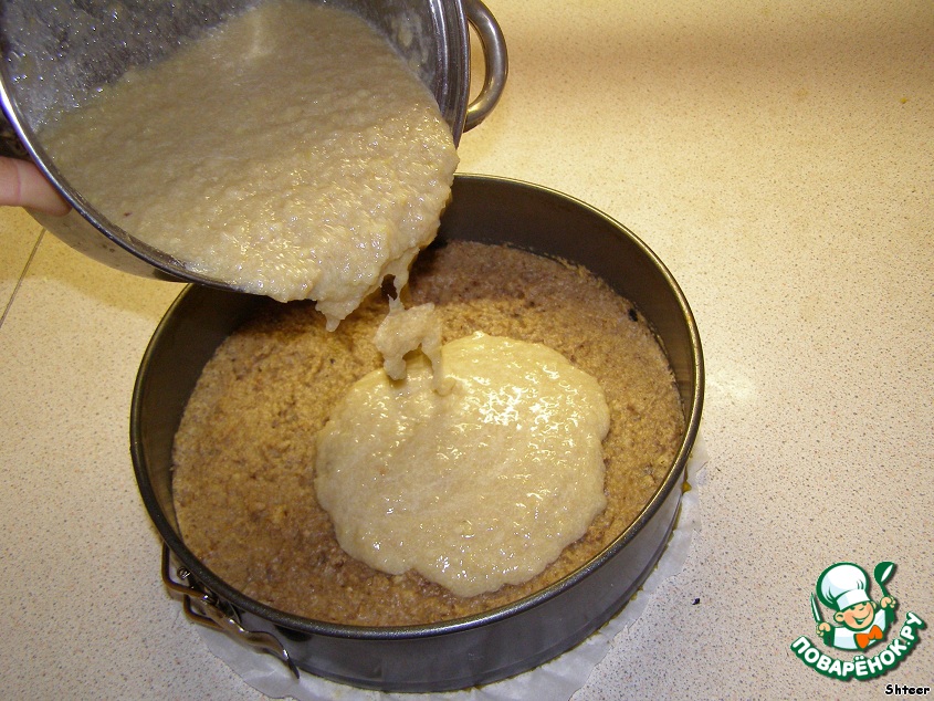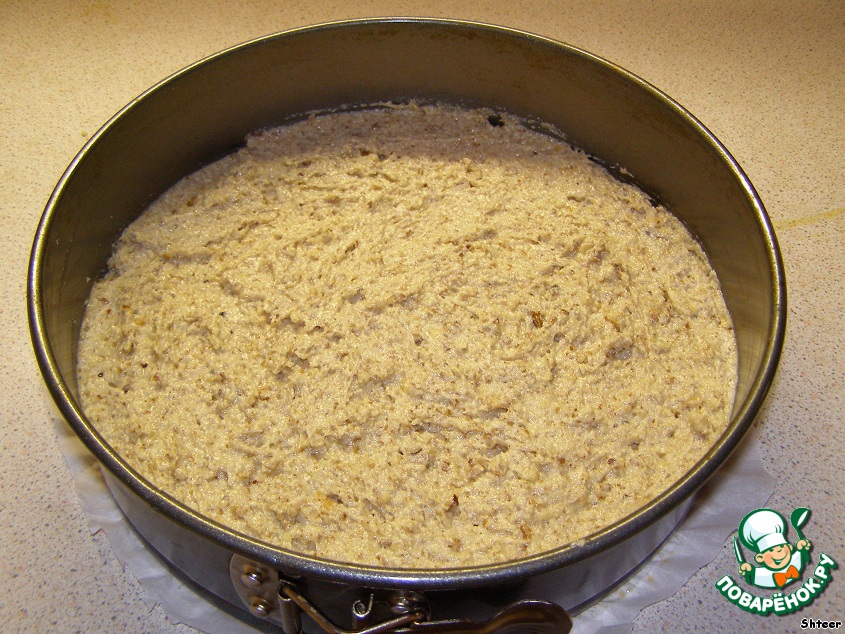 Разъемную форму (диаметр 26 см) застелить пергаментом. Распределить по её дну масляно-ореховую массу. Выпекать в разогретой до 170 градусов духовке 15 минут. Затем вынуть и остудить.