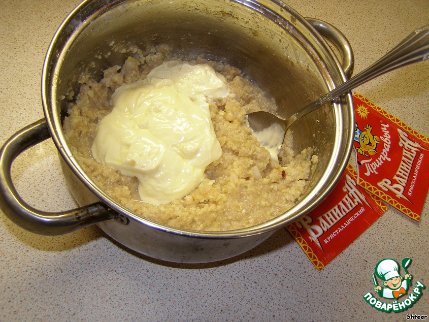 Смешать проваренные груши, измельченный миндаль и 120 грамм сливочного масла комнатной температуры. Добавить 3 грамма ванилина и перемешать.