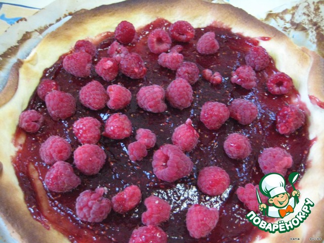Смазать корж мармеладом, выложить сверху малину и поставить в холодильник.