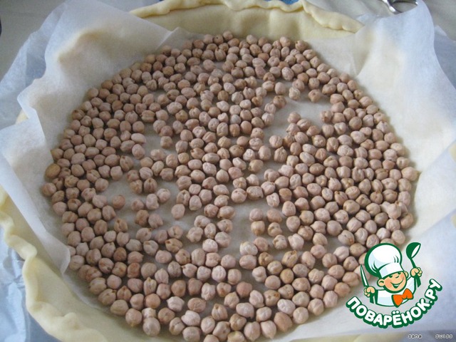сверху на бумагу для запекания выложить сухие бобовые, что бы при запекании сохранить форму коржа;