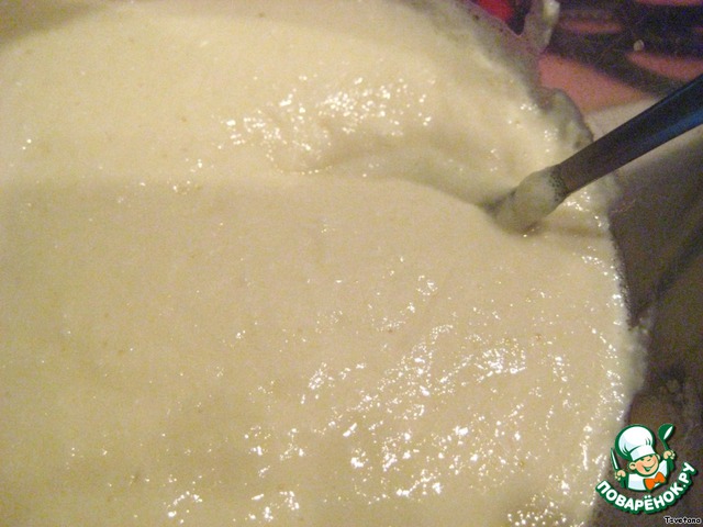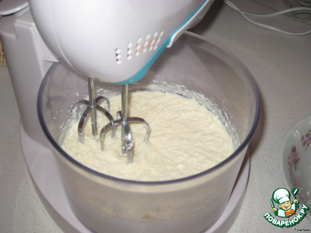 800 г творога положить в дуршлаг и дать стечь. Затем творог перемешать с 4-мя желтками, 180 г сахара, сметаной, ванильным сахаром, взбить миксером – не менее 10 минут.