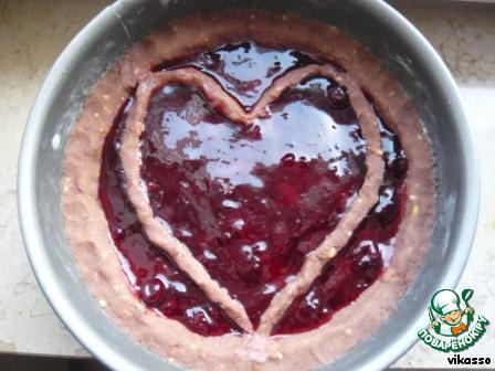 Теперь приступаем к тому, что в сущности и придает окончательный, узнаваемый образ Линцскому торту. Решетка! Формируем из оставшегося теста полоски и выкладываем на тесто с вареньем решетку. Впрочем, я варьирую. 14 февраля я нахально испекла этот торт не с решеткой, как положено, но с сердечком).