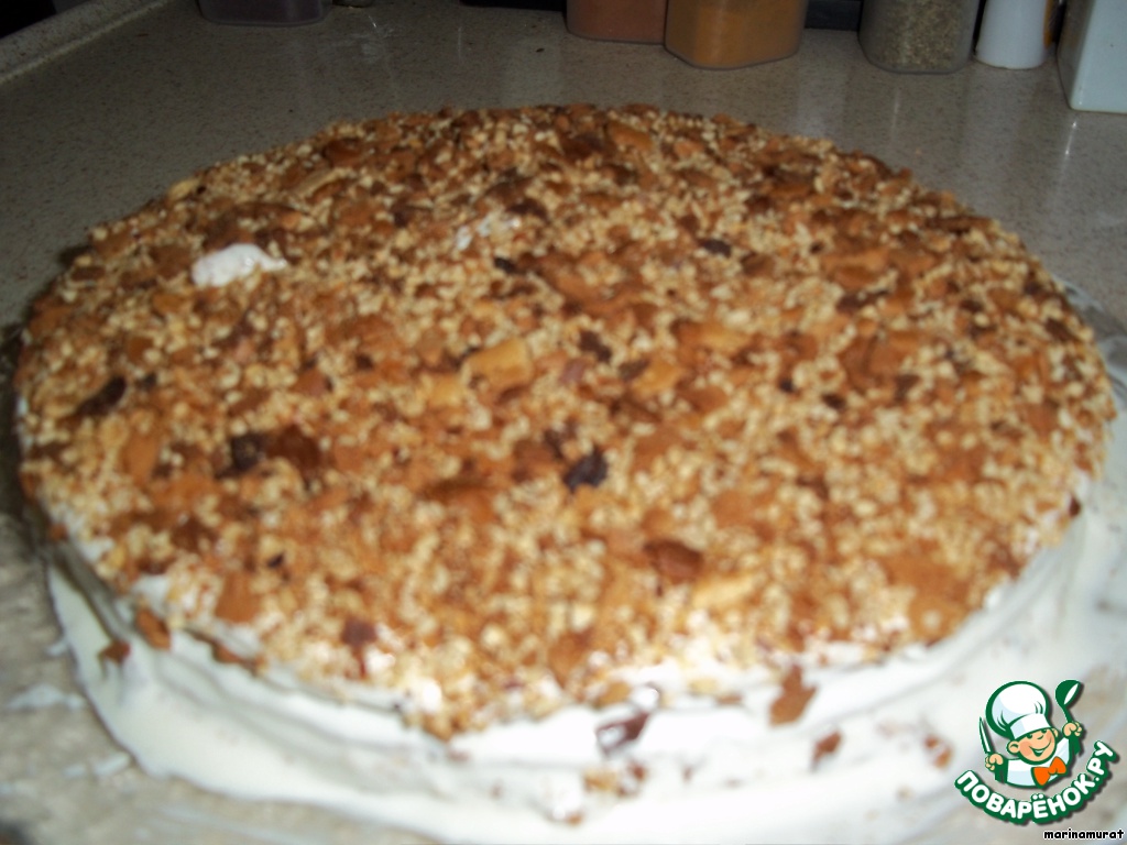 Обрезки я измельчила несильно и смешала с фундуком - это для обсыпки торта. Собираем торт. На каждый корж у меня уходило 3 ст. л. крема.