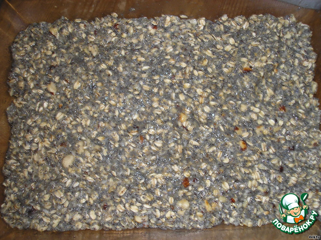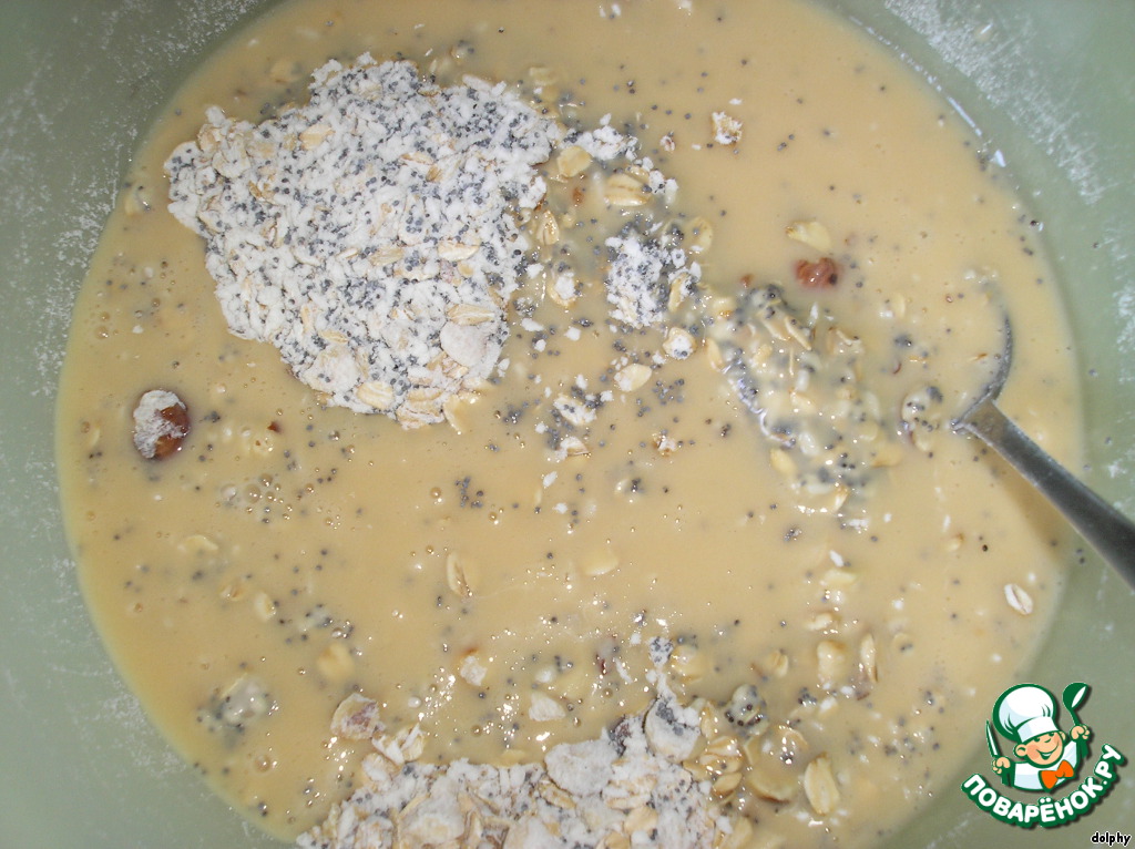 Смешайте муку, пекарский порошок, овсяные хлопья, кокосовую стружку, мак, сахарную пудру и 1/2 стакана орехов. Вообще этот коржик делается без мака с 1 стаканом кокосовой стружки, но у меня дома ее было только полстакана, поэтому я добавила мака. Получилось хорошо, так что вы можете действовать на свое усмотрение.