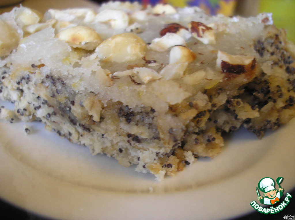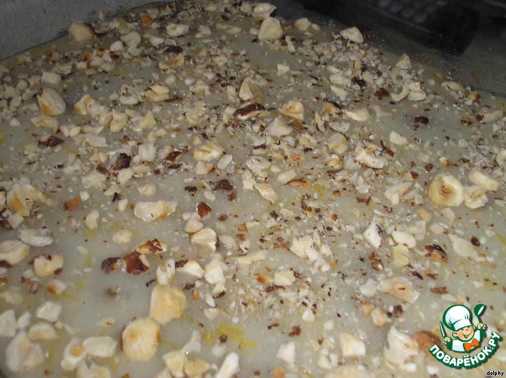 Посыпьте оставшимися орехами. Перед тем как резать коржик, дайте глазури застыть.