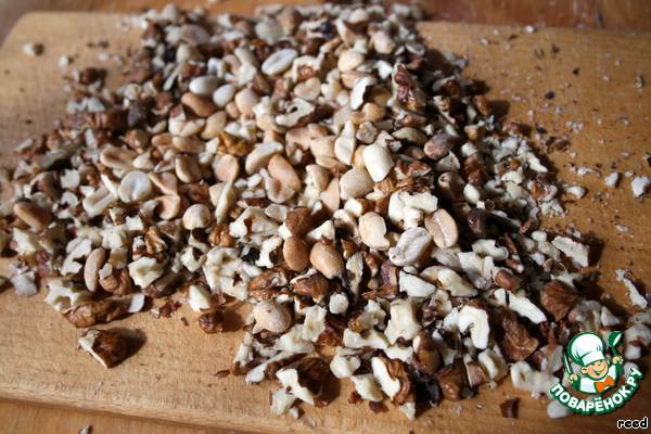 Орехи (я взяла пополам грецкие и арахис) порубить.