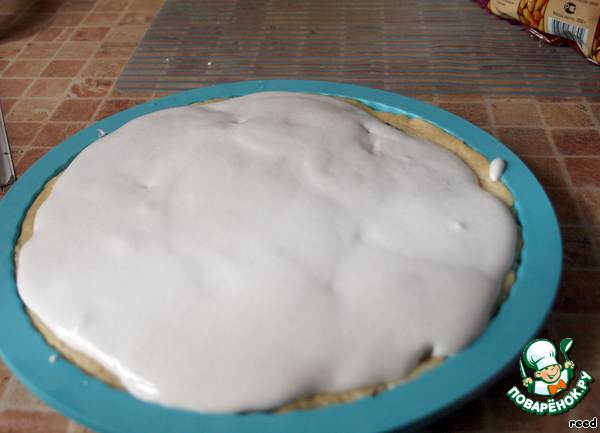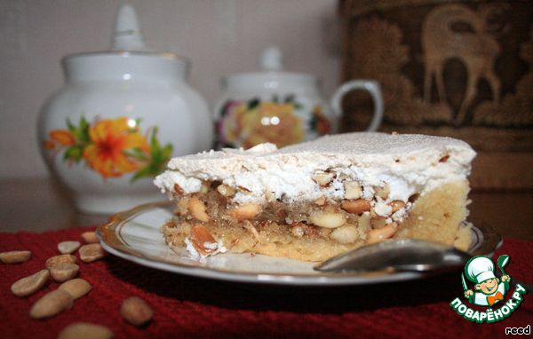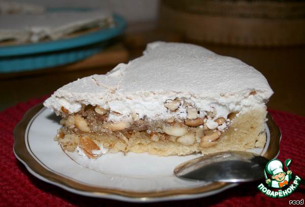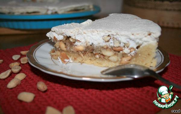 Тесто раскатать и выложить в форму, сделав бортики. Сверху высыпать орехи, разровнять. Белки взбить с сахаром, выложить на орехи и поставить в предварительно разогретую до 180 градусов духовку на 50 минут.