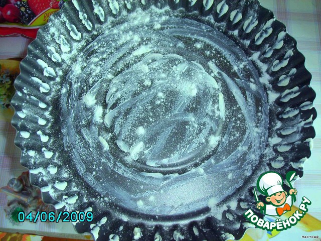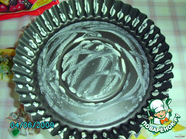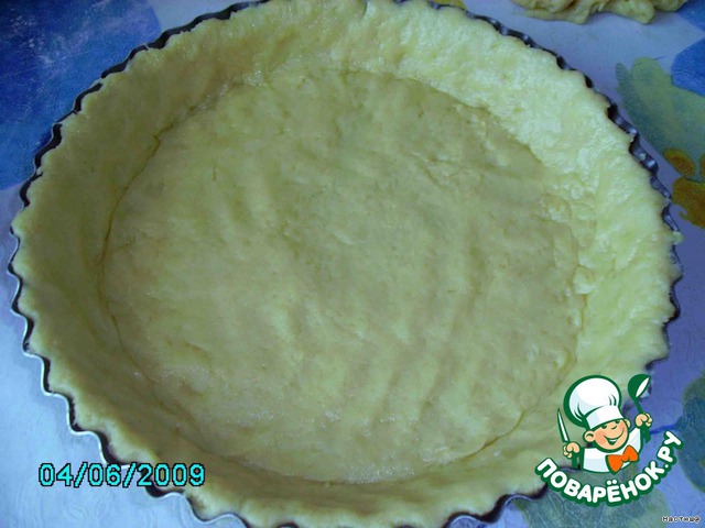 Тесто раскатать в пласт и перенести в форму. Остатки убрать, дно проколоть вилкой, чтоб не образовалось пузырей. Поставить в холод на 20-30 мин.