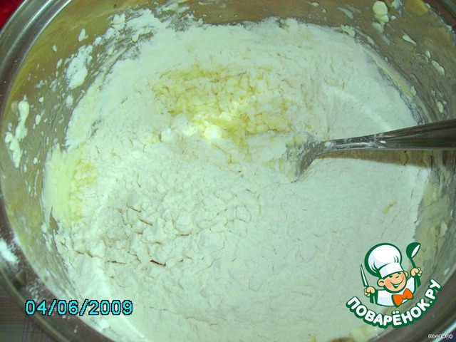 Затем добавляем муку с ванилином и вымешиваем тесто.