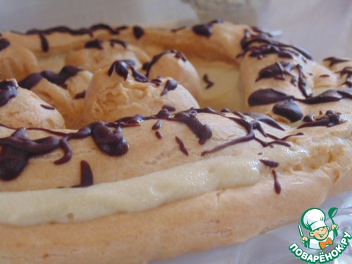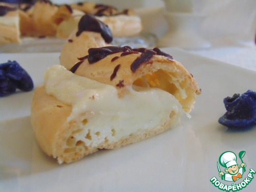 Сборка торта: кольцо разрезаем пополам, из кондитерского мешка заполняем нижнюю часть кремом. Сверху кладем вверх кольца. Эклеры разрезаем пополам, заполняем кремом.