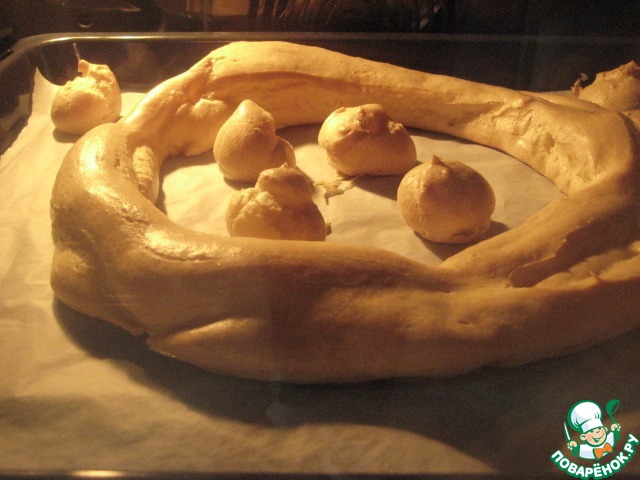 На бумаге для выпечке нарисовать круг 23-26 см, из кондитерского мешка выдавить три круга: два рядом и третий сверху.