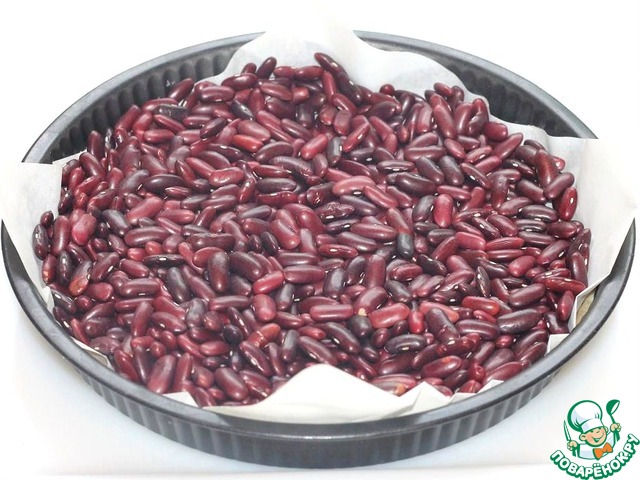 Насыпаем сверху фасоль и ставим в разогретую духовку на 15 минут при 190°С. Затем убираем фасоль и ещё 10 минут допекаем. Готовый корж достаем из духовки и даём остыть.