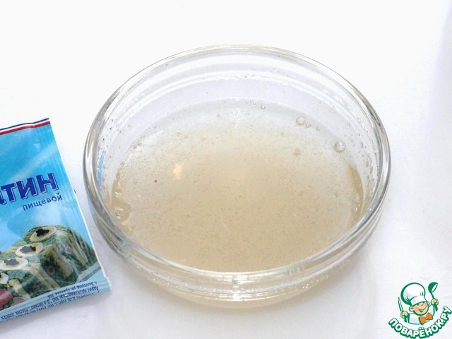Желатин зальём водой (1:6). Затем распустим его в микроволновке или на паровой бане. Можно приготовить по инструкции.