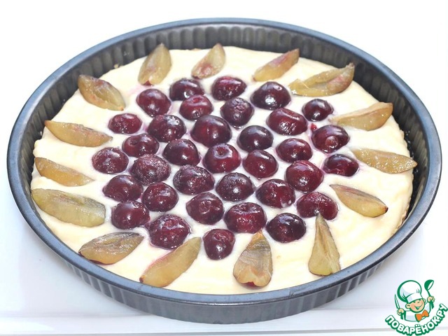 Сверху кладём ягоды: черешню, клюкву и дольки сливы. Ягоды могут быть и другие, главное, чтобы их было несколько видов (разные).