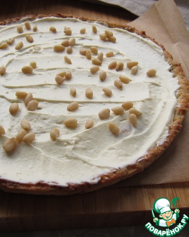 Половиной крема смазать песочную основу и посыпать кедровыми орешками.
