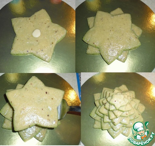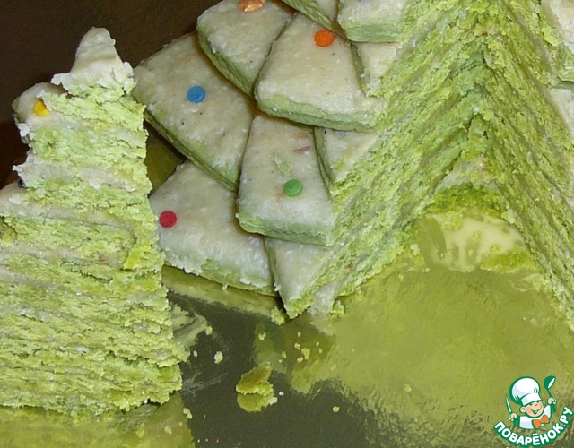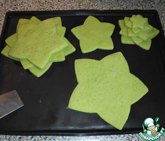 Приступаем к сборке. Для этого, самый первый коржик, кладем на тарелку или специальную подложку, слегка смазанную сгущенкой (это для того чтоб готовый торт не «бегал»). Далее тот же принцип, на каждый коржик капнем сгущенку, а сверху кладем новый. Коржи переносите аккуратно, на лопаточке, во избежание поломки. Таким образом собираем ёлку целиком, смещая иголочки.