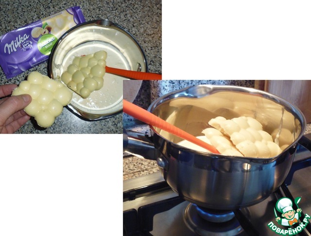 для этого, в кастрюлю с толстым дном наливаем сливки и добавляем белый шоколад. Шоколад у меня оказался воздушный, всего 80 грамм, да еще и с фундуком, но это не страшно. Ставим кастрюлю на самый медленный огонь и ждем когда растопиться шоколад. Тоже самое можно сделать и на водяной бане.
