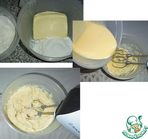 Часть муки (ложки 3-4 столовых), перемешиваем с размягченным сливочным маслом. Я взбила миксером. Затем добавляем желтковую смесь и перемешиваем до однородности.