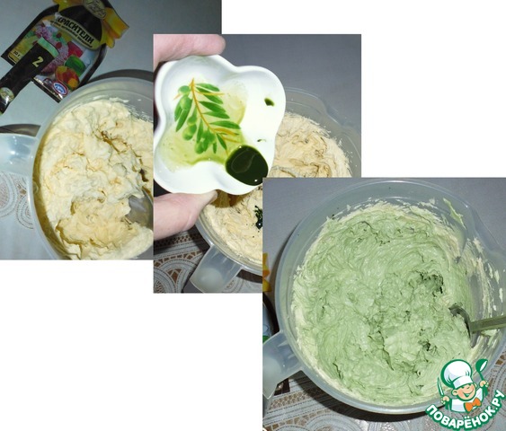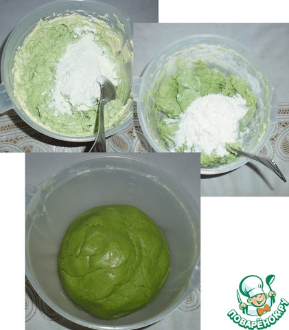 На этом этапе самое время добавить краситель (при желании). В качестве красителя можно использовать фисташки, зелень, цукаты помело или, за не имением таковых, готовый краситель зеленого цвета. Для этого сперва разводим его в малом количестве воды и вливаем в тесто. Так как здесь мы используем, дополнительно, воду, то расход муки немного возрастет.