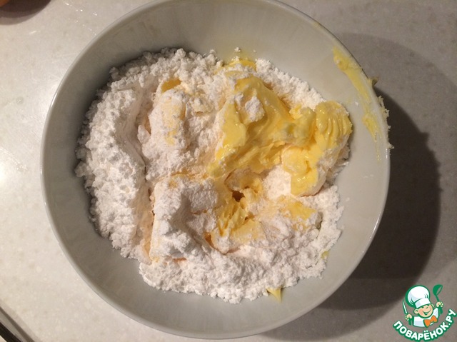 Сливочное масло заранее достать из холодильника, чтобы оно растаяло и стало мягким. Как только это произойдет, соединить масло с сахарной пудрой (100 г), солью.