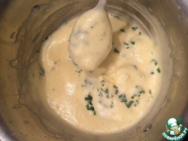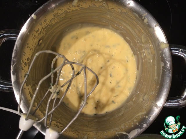 Кастрюлю поставить на небольшой огонь. Постоянно помешивая, довести яичную смесь до состояния густой сметаны (у меня это заняло примерно 12-15 минут). Снять с плиты, добавить мелко порезанный базилик и остудить до теплого состояния.