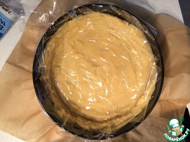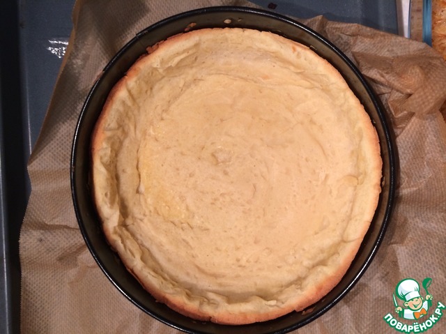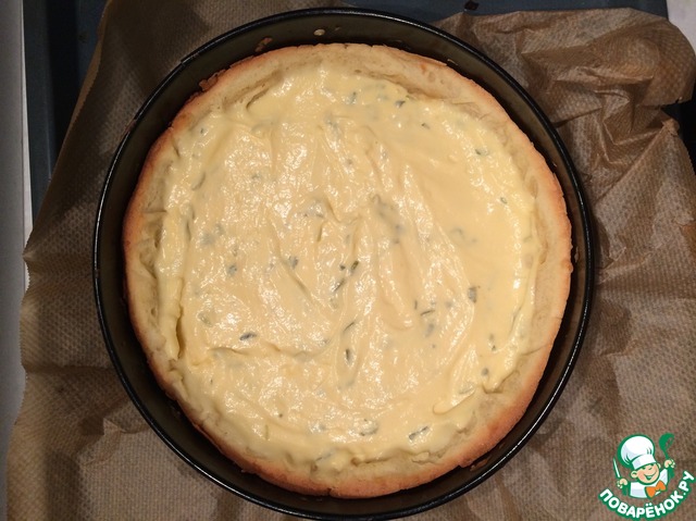 Выложить остывшую и загустевшую яичную начинку в основу (т. е. в корж, который по-прежнему находится в форме) и разровнять.
