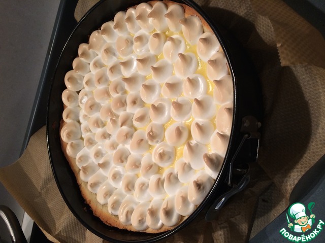 Готовому коржу-основе нужно дать остыть (он может быть немного влажный от масла, но потом остынет и станет нормальным). В это время взбить яичные белки с сахарной пудрой до образования крепких (нерасползающихся) пиков.