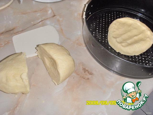 Тесто разделить на 3 части, первый слой руками разложить по форме.